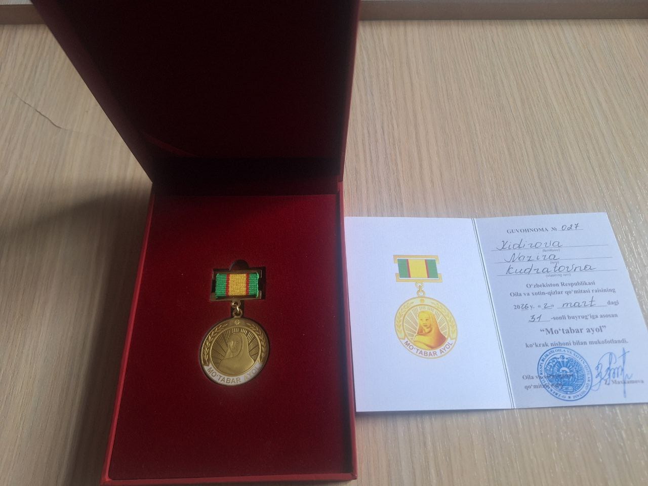 Dr. Nazira Kudratovna Khidirova, Leading Researcher of the Department of Organic Synthesis at the Institute of the Chemistry of Plant Substances named after Academician S.Yu. Yunusov of the Academy of Sciences of the Republic of Uzbekistan, has been awarded the honorary “Mo‘tabar Ayol” (Esteemed Woman) badge.